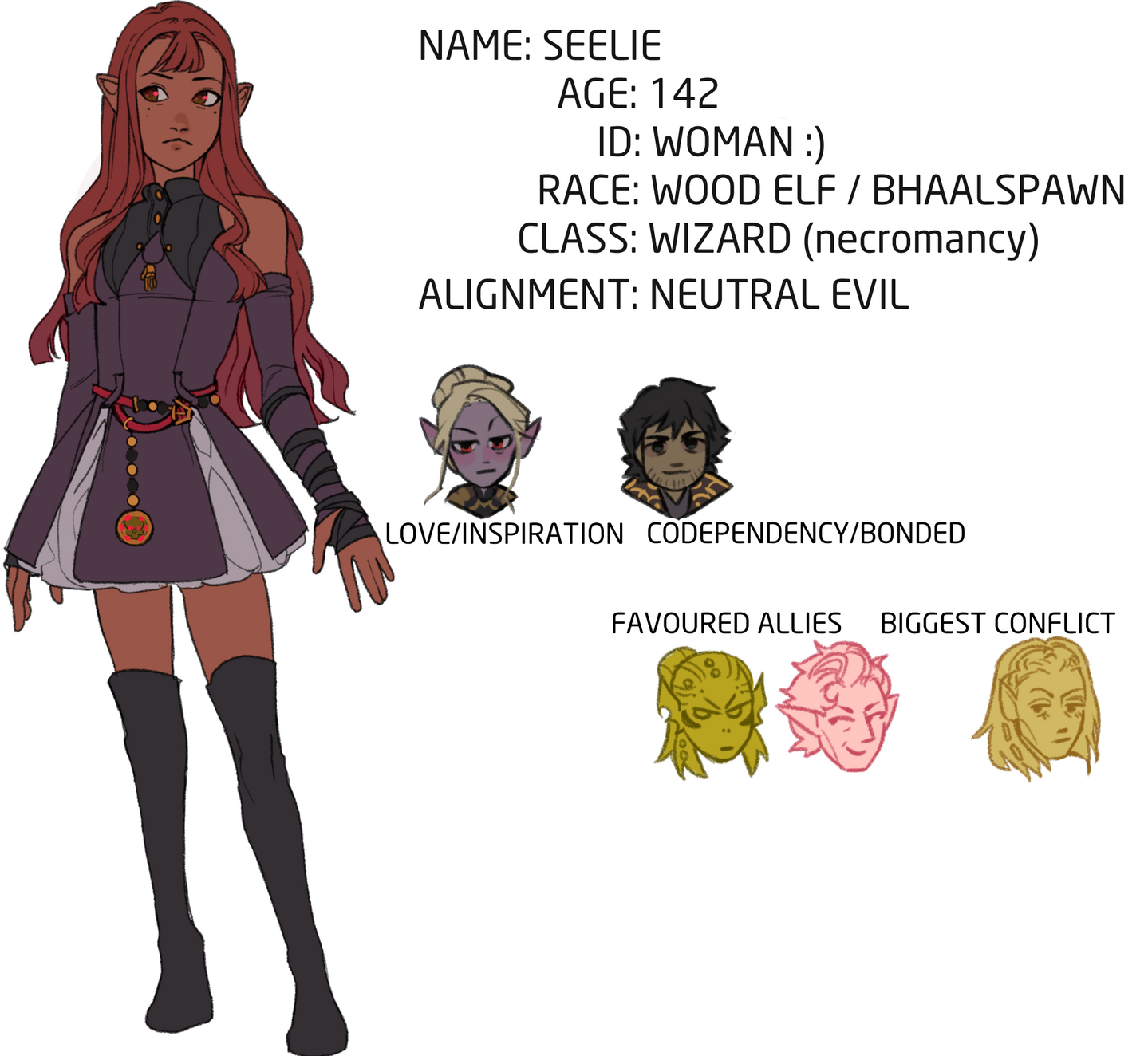 Pre game: | often times lived with families with the intention of working as a farmhand or in domestic labor, rarely felt as though she was anyone's child. most caretaking memories are with sceleritas. frequently moved as the urges had a tendency to end with empty households. | sees her life as truly beginning once studying in the neverwinter academy. her interests expanded from conjuration to necromancy. outside combat magic, runecasting was what fascinated her the most. mastering her urges came with a stronger incentive when it threatened interfering her studies or expulsion. her purpose as the dark urge was clarified in this time, as well as her need to move to baldurs gate. |