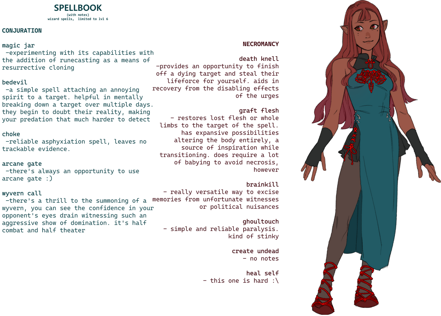city reputation | held a front as advising wizard to Gortash, a role she took in earnest. | being a shady wizard advisor to a separate, shadier advisor gave her a good amount of notoriety, and equal distrust. her disarming presence partially softened this. |